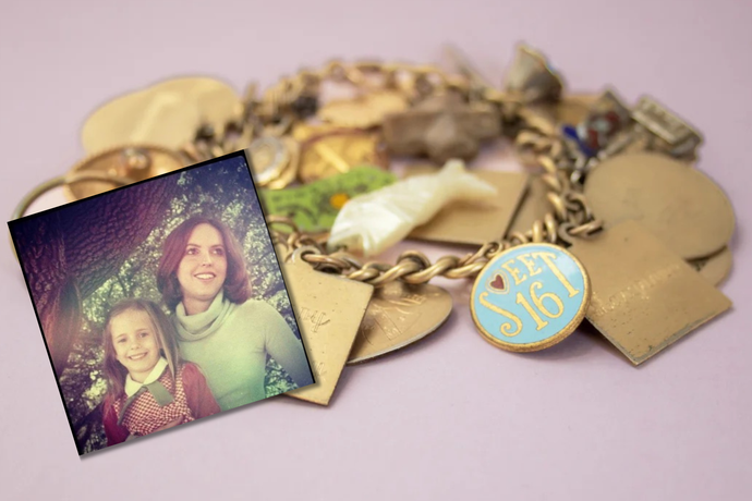 While going through Mariann’s things, Stacy found her mom’s treasured high school charm bracelet tucked among her possessions. Amid the Sweet 16 and graduation charms were charms commemorating girls trips to Mexico, California and Paris. One charm, engraved with the name Wayne holds the mystery to a long ago romance. Academic achievements and symbols of Mariann’s faith are nestled next to charms engraved with her girlfriend’s names.
